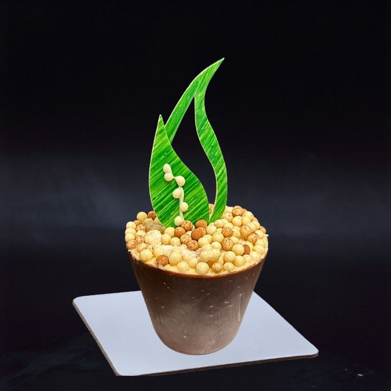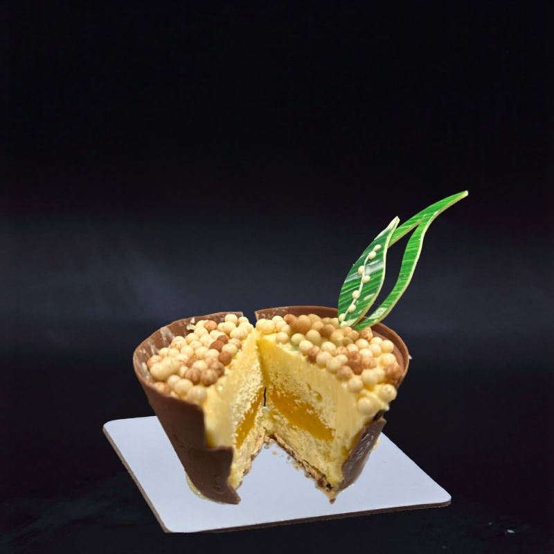 Le Pot de Muguet de la Maison FRED : une création originale et printanière composée d’une pâte à baba moelleuse, d’un confit de mangue, d’une crème citron et d’une marmelade citron, le tout recouvert d’un palet en chocolat au lait.